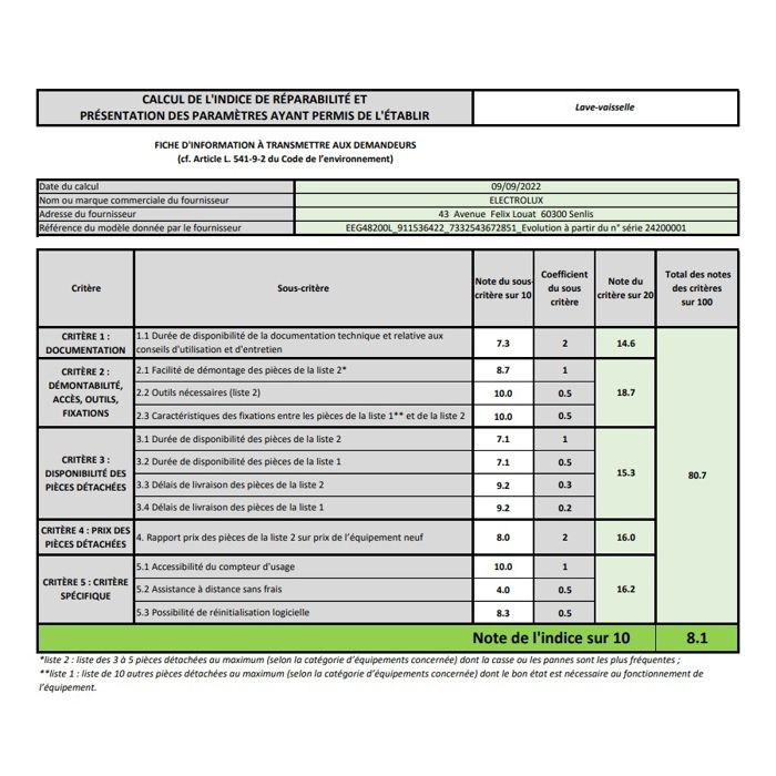 | Indice de réparabilité | 8,1 |