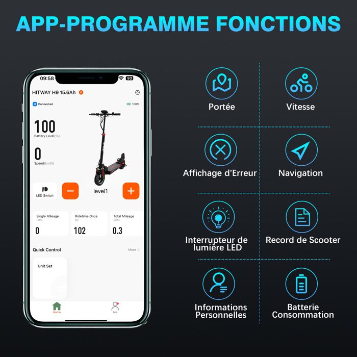 - 3 Modes de Vitesses: 10KM/H; 15KM/H; 25KM/H
